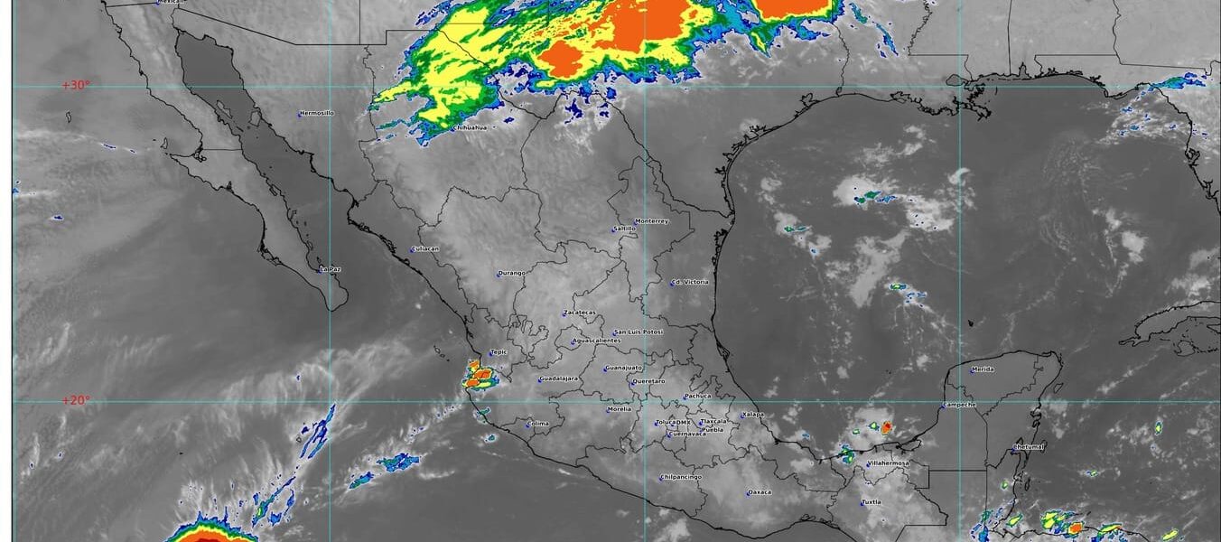 Un canal de baja presión sobre el interior del país, aunado al ingreso de humedad del océano Pacífico y el golfo de México favorecerán intervalos de chubascos en Veracruz (regiones Las Montañas y Olmeca), Nayarit (norte, centro y sur), Jalisco (oeste y sur), Colima, Tabasco (oeste y centro), Michoacán (centro, sur y costa) y Guerrero (norte, costa y sureste). Viento de componente sur (surada) de 20 a 35 km/h con rachas de 50 a 70 km/h en Coahuila (este), Nuevo León y Tamaulipas.