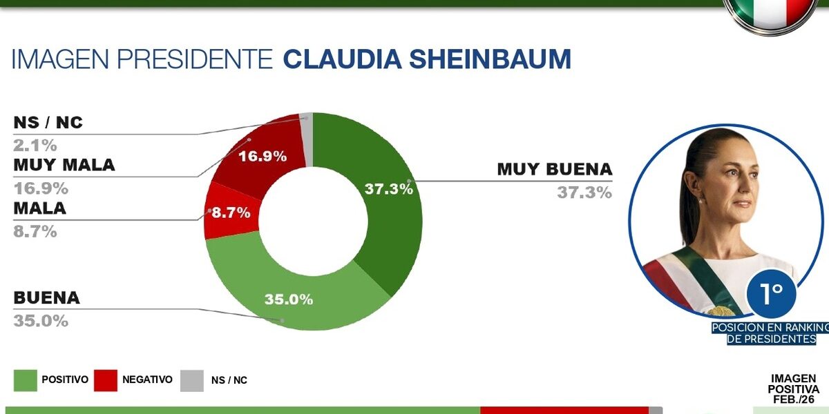 Por categoría de respuesta, se indicó que Sheinbaum recibió una valoración muy buena del 37.3 por ciento, buena del 35 por ciento; mientras que la imagen mala fue de 8.7 por ciento y muy mala del 16.9 por ciento.