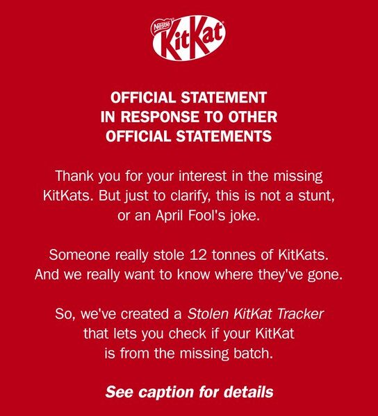 “Hemos creado un rastreador de KitKats robados que permite verificar si tu KitKat pertenece al lote desaparecido. Ayúdanos a encontrarlas”, publicó la firma, junto con un enlace para acceder al sistema.